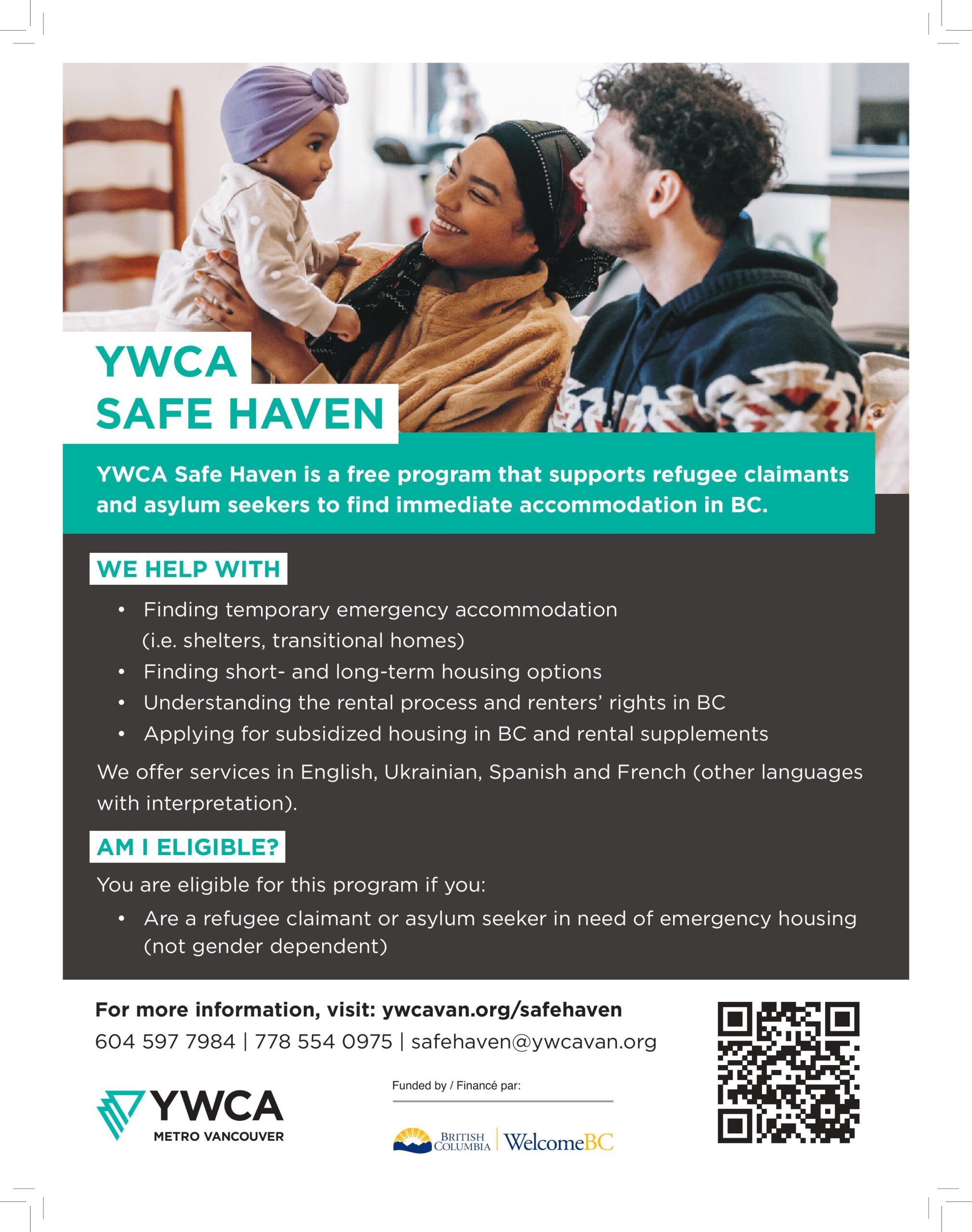 Eligible individuals can access help in English, Ukrainian, Spanish, and French. For more information, visit YWCA Safe Haven or contact 604-597-7984 / 778-554-0975 / safehaven@ywcavan.org.