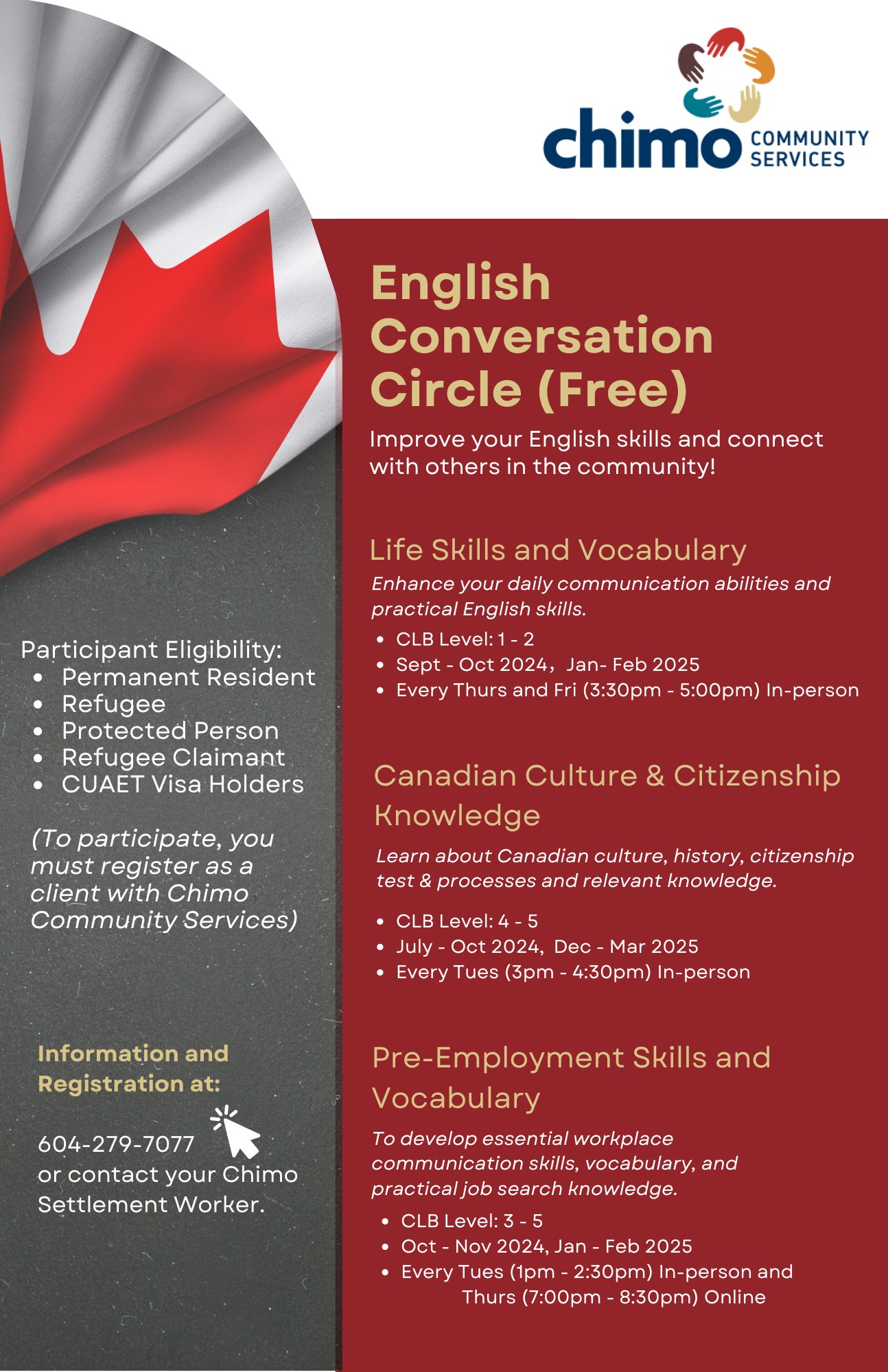 - Canadian Culture & Citizenship Knowledge (CLB 4-5) on Tuesdays from July to March 2025; and